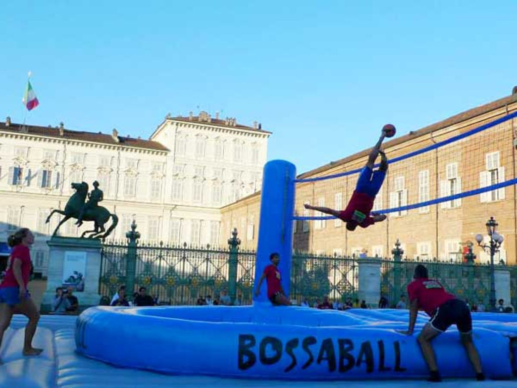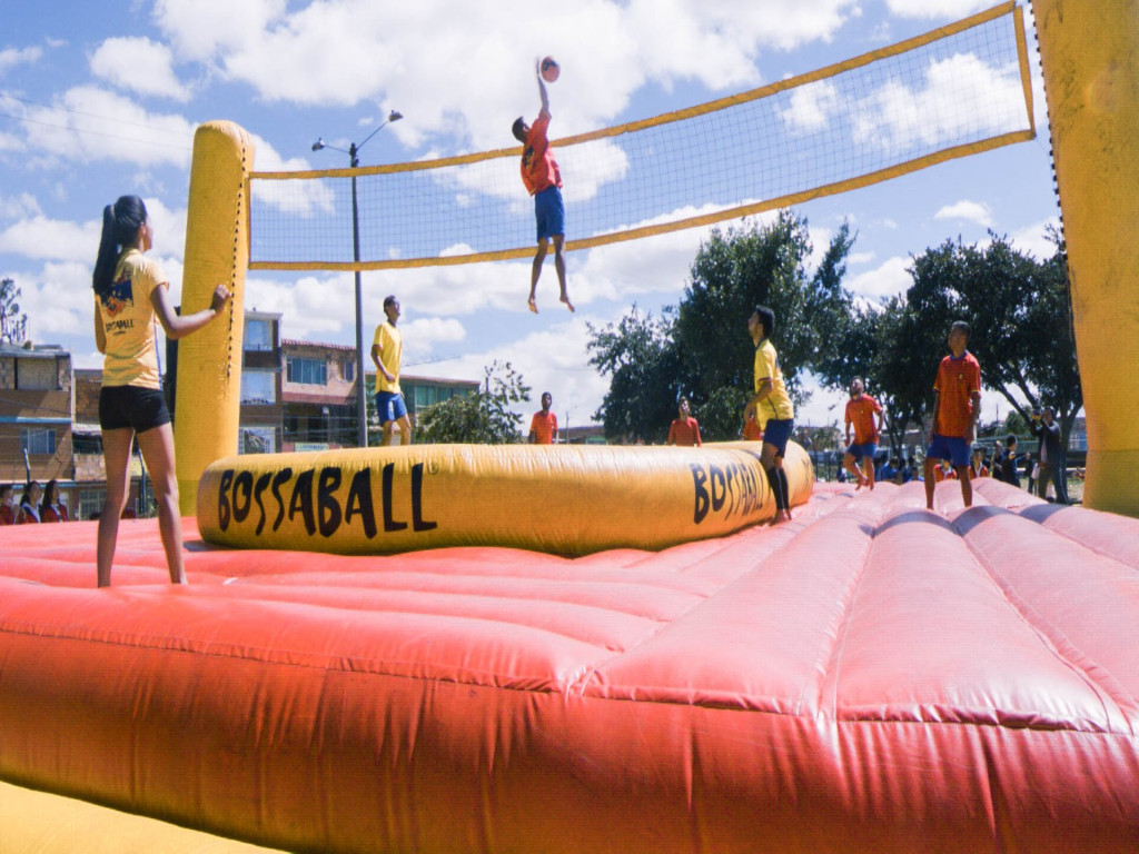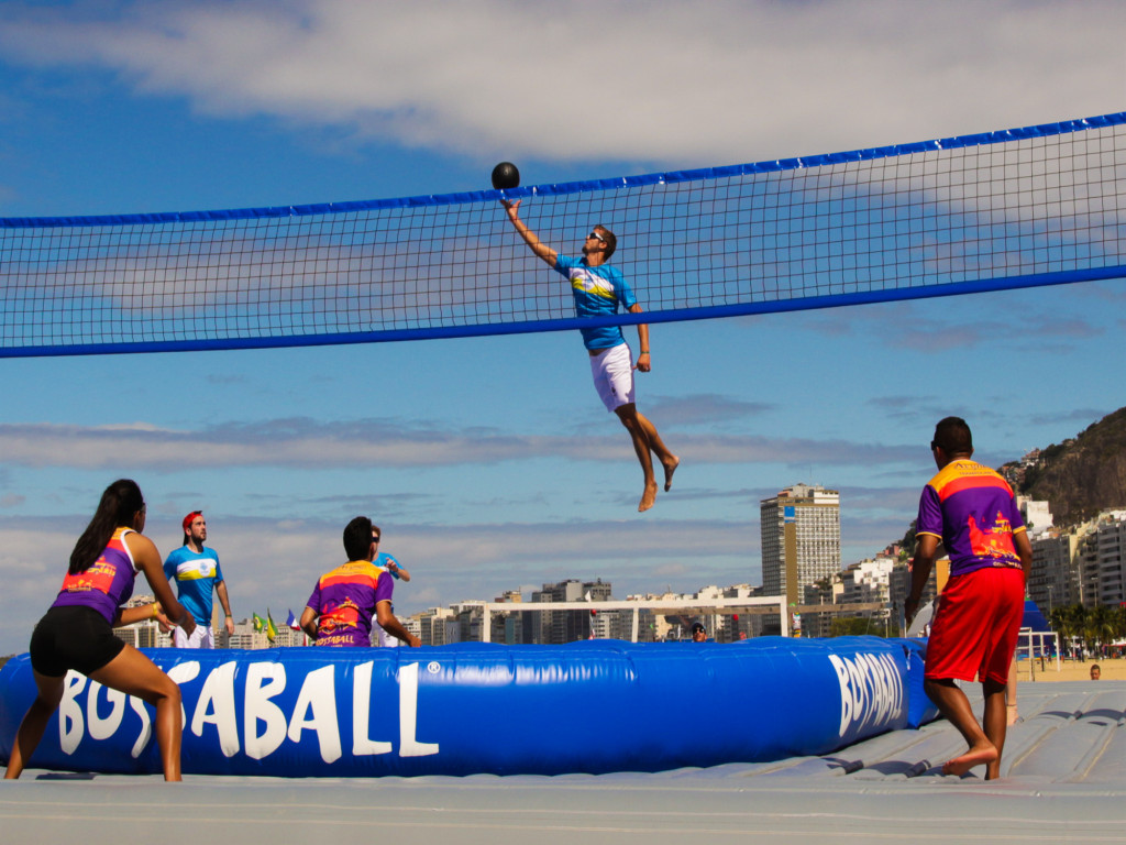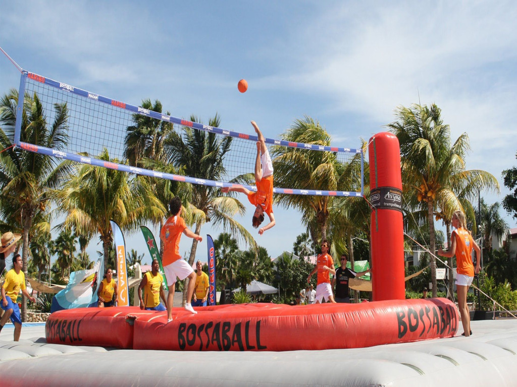 Bossaball is a new sport that combines elements of volleyball, football, gymnastics and capoira dancing with music.It is played on an inflatable court featuring a trampoline on each side of the net.People Jump, stretch, hit the ball, dance and celebrate each point!