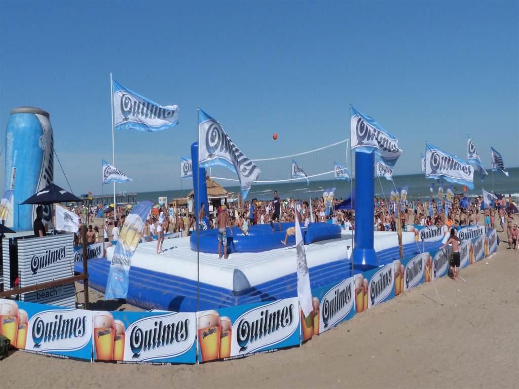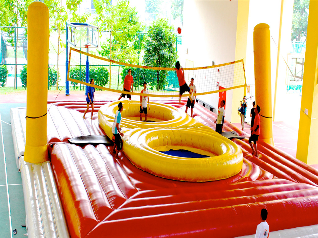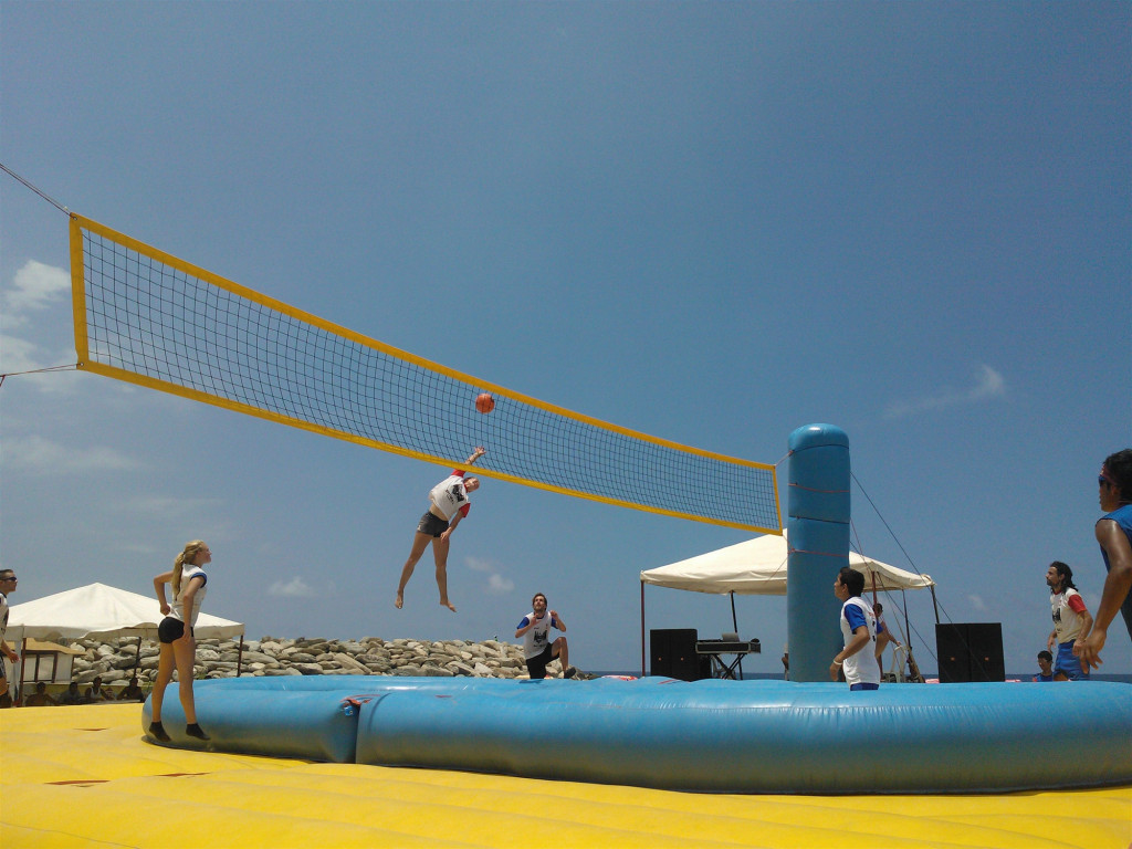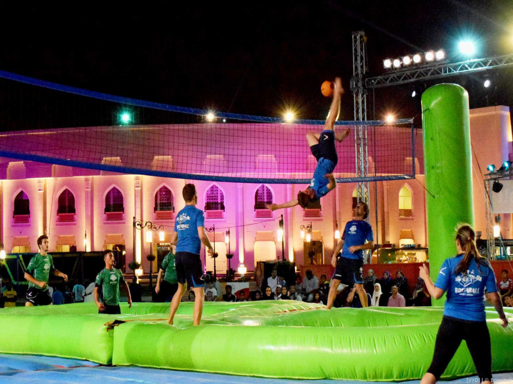 Bossaball is a new sport that combines elements of volleyball, football, gymnastics and capoira dancing with music.It is played on an inflatable court featuring a trampoline on each side of the net.People Jump, stretch, hit the ball, dance and celebrate each point!