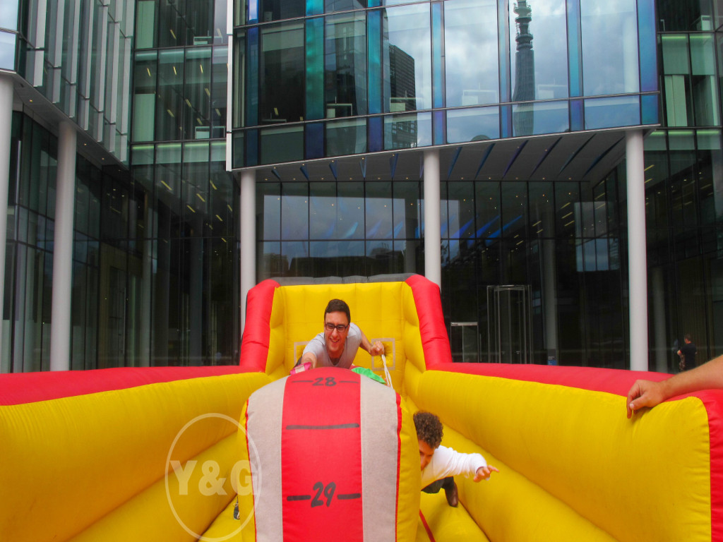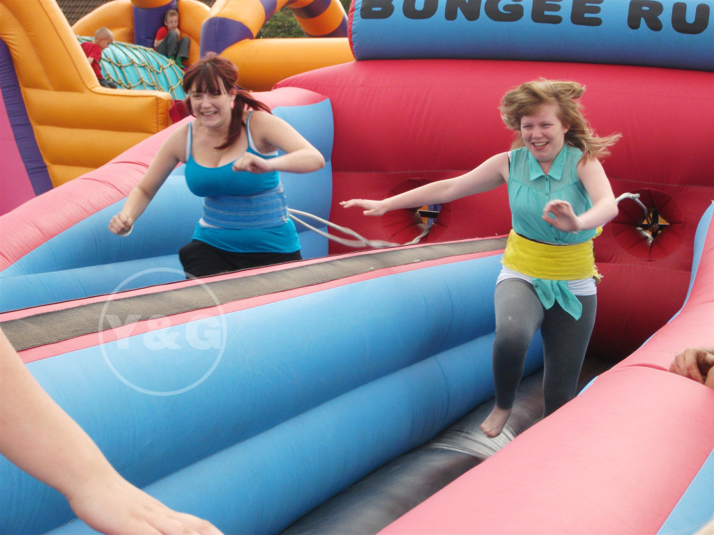 Inflatable Bungee Run is a fun competition between two people.Each competitor gets strapped into a vest which is attached to a giant bungee cord.  The goal is to run as far as possible, and lay your marker on the velcro strip before the bungee'snaps you back to reality'.
