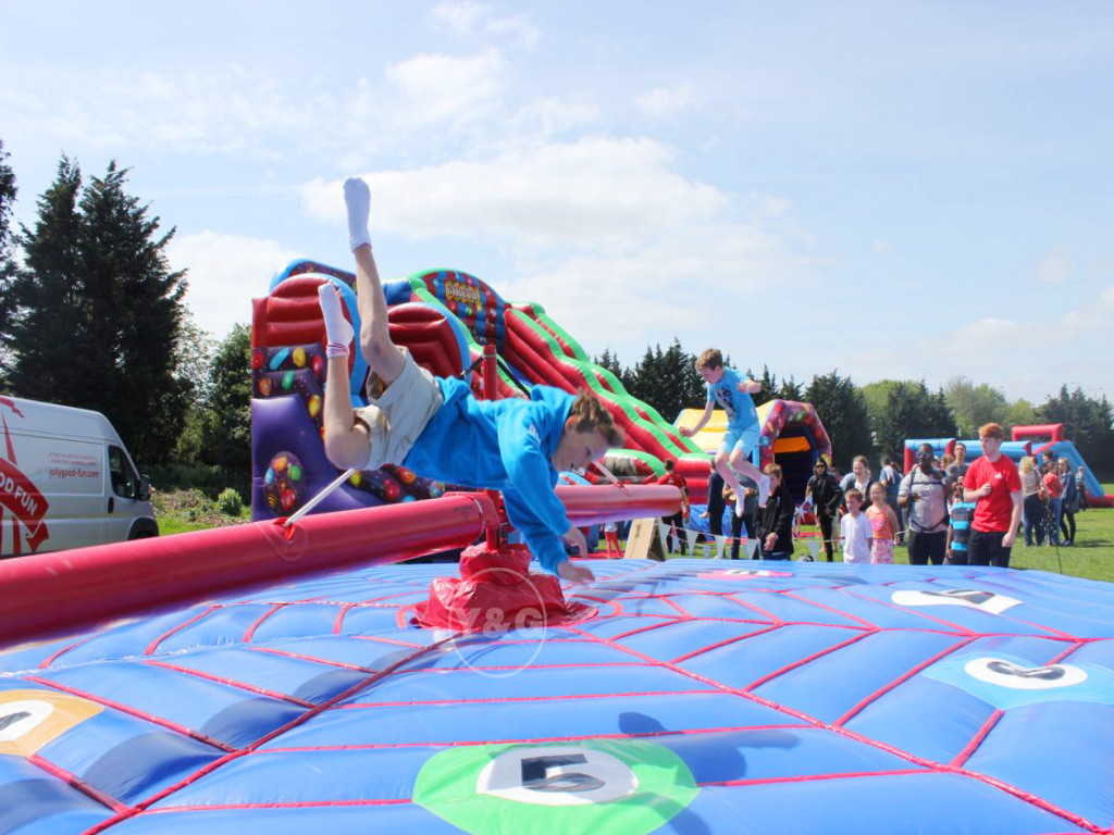 The sweeper inflatable pad challenge is about to begin, keep an eye out, becaus the rotating posts in the middle will knocking you off before you know it.Will you be the last one standing?